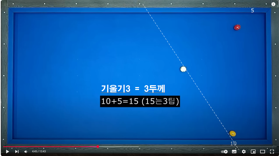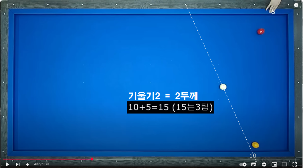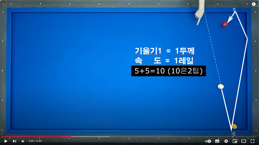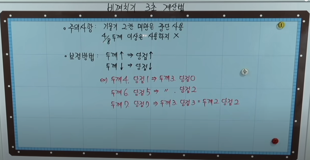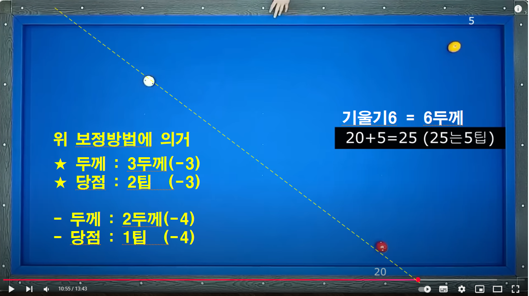 두께 3이상 및 3회전 이상일 경우 보정하는 보정방법입니다. 이 방법을 이해하면 2레일 속도로 부드럽게 치는 방법을 이해 할 수 있습니다.