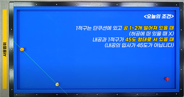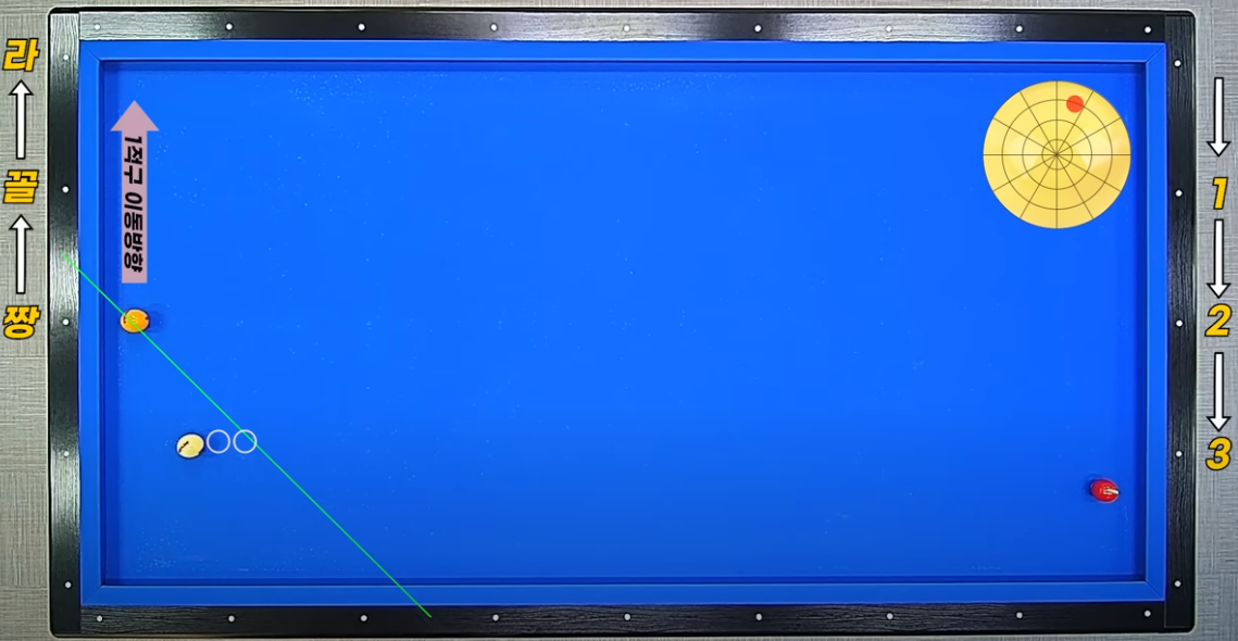 - 큐볼이 45도 각도에 배치되어 있을때 짱골라123으로 보고 2목적구 위치의 회전수를 산출