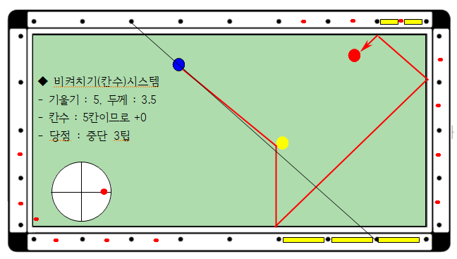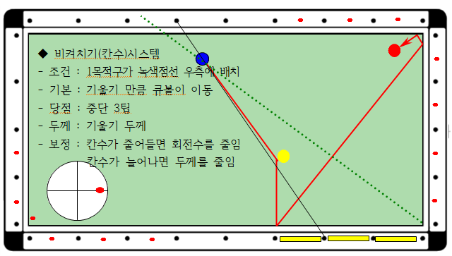 - 따라서 당점은 상단3느낌팁(무회전)이 됩니다.