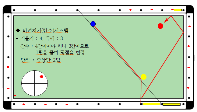 - 따라서 당점은 중상단2팁(-1팁)이 됩니다.