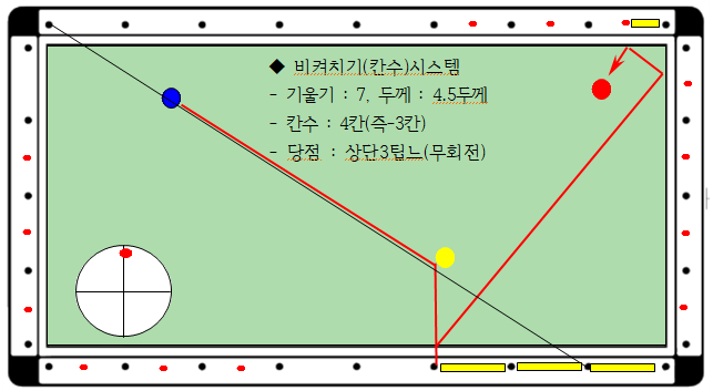 - 검토 : 기울기7이므로 7칸 진행하여야 하는데, 2목적구가 4칸이므로 3칸이 부족합니다.