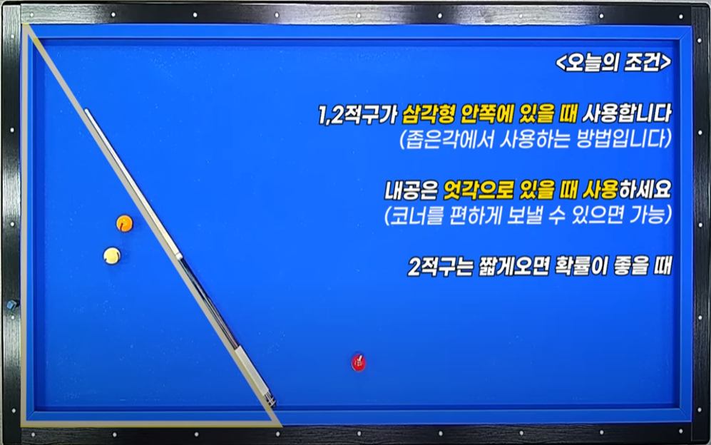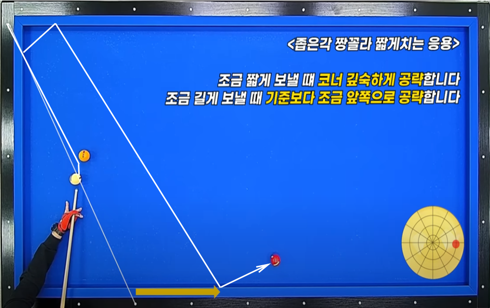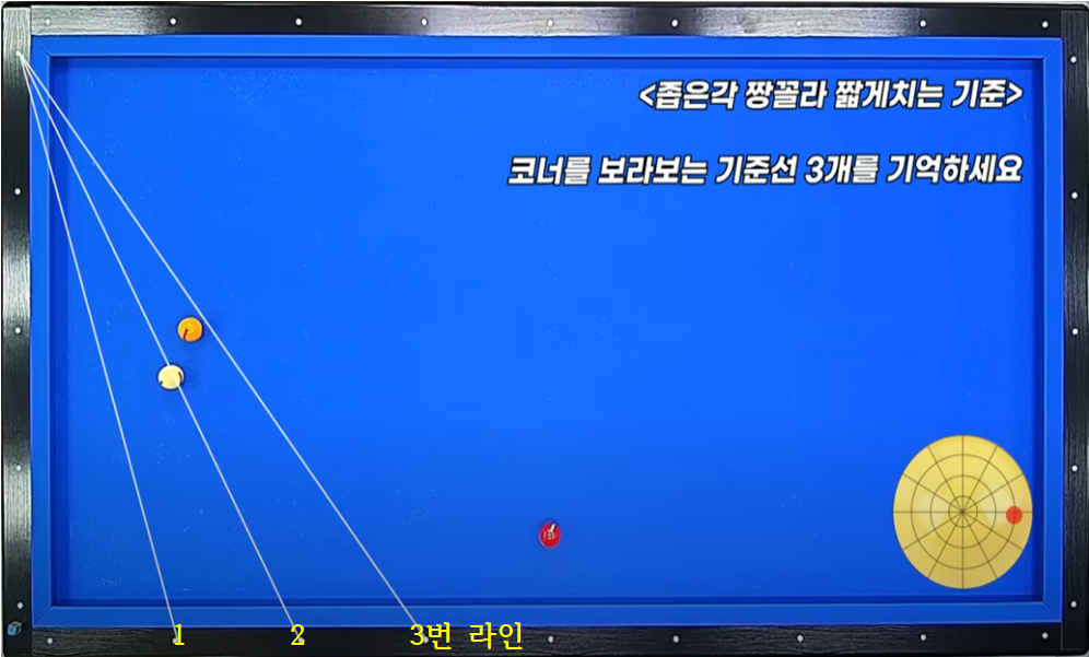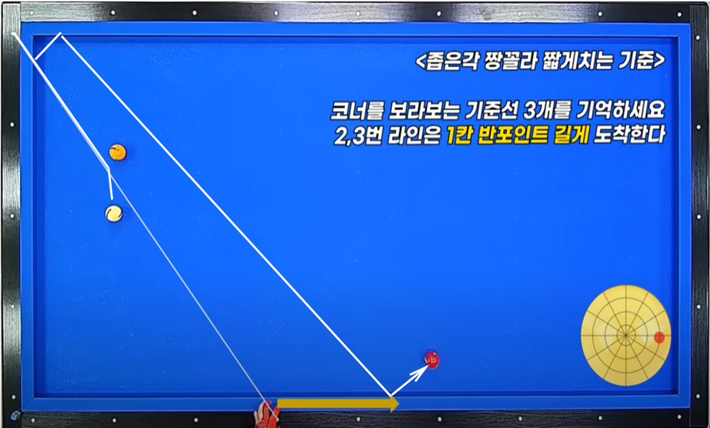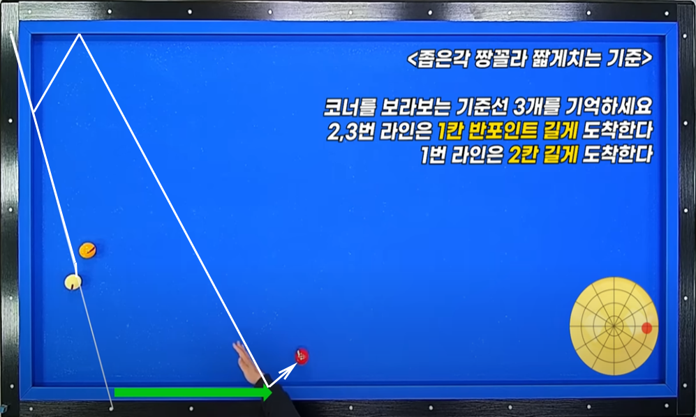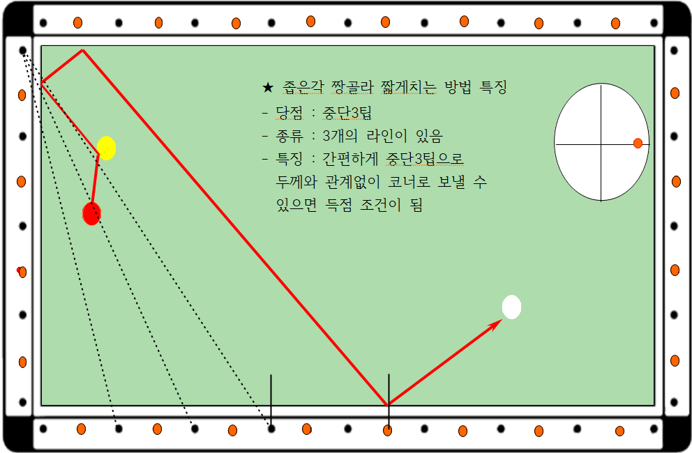 비켜치기(코너단장장)시스템이란 큐볼이 3쿠션으로 돌 때 단축코너를 반드시 1쿠션으로 2쿠션(장쿠션) 3쿠션(장쿠션)으로 지나는 시스템 입니다.