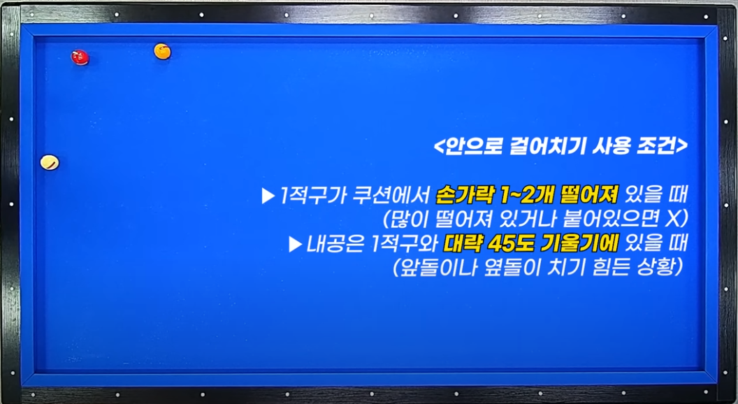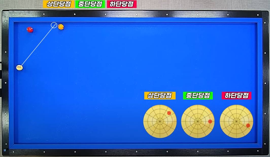 - 큐 볼 : 1목적구와 45도 전후에 배치 - 45도를 많이 벗어나면 앞돌리기가 더 유리합니다