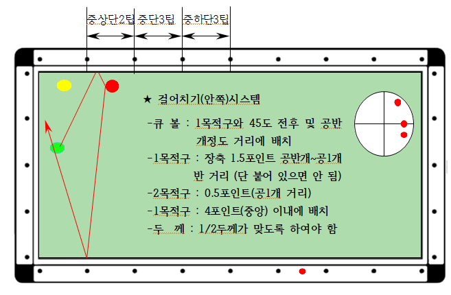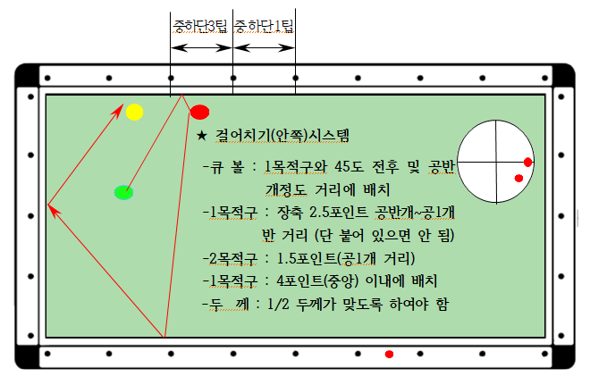 - 1목적구 : 장축 1.5포인트 공반개 ~ 공1개반 거리 (단 붙어 있으면 안 되며 공3개 이상 거리일 경우 넣어치기 또는 비켜치기가 더 좋을 수 있습니다)