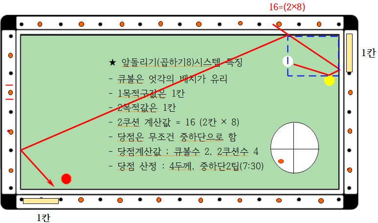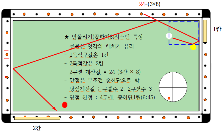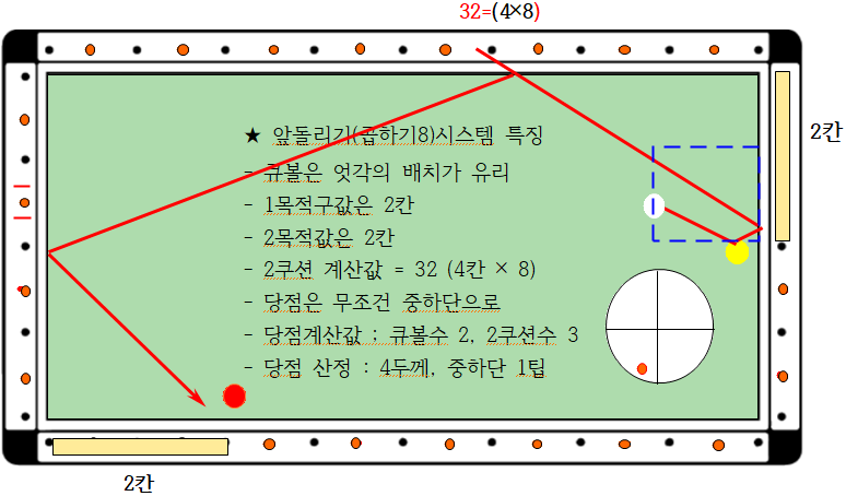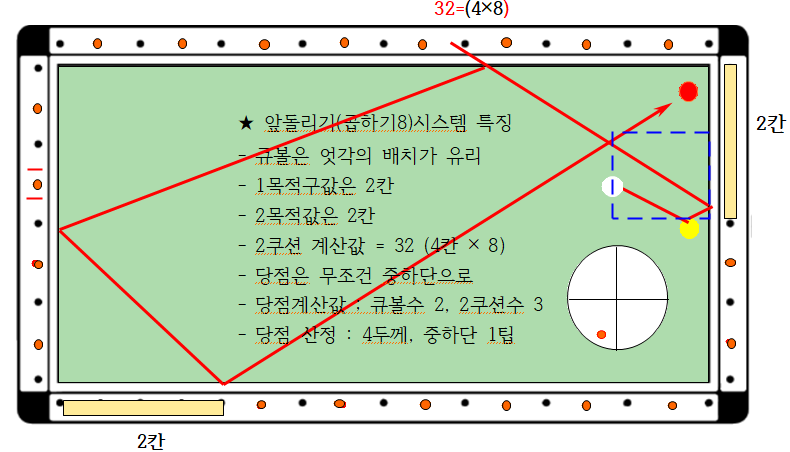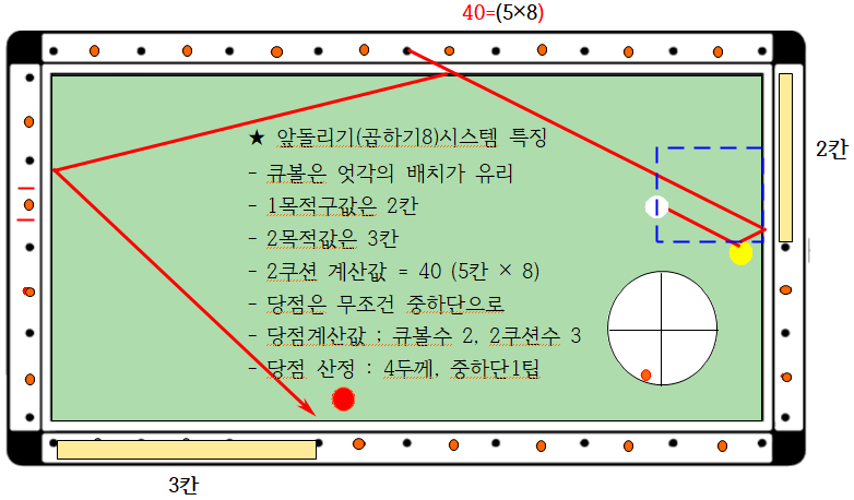 앞돌리기 곱하기8시스템이란 큐볼수 칸과 3쿠션수 칸을 더한(플러스) 후 합한 수에 곱하기8을 한 것으로 시스템을 외우기 좋게 설명한 것을 의미합니다