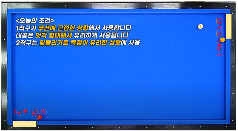 - 당점은 무조건 중하단(큐볼이 엇각인 경우)으로 함