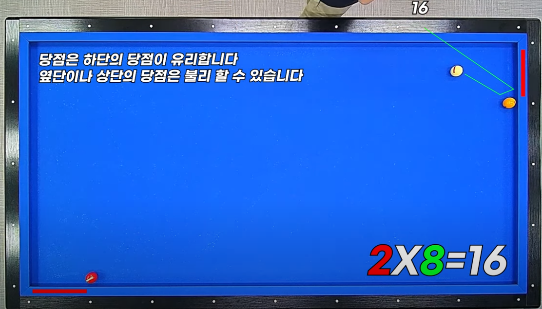 - 당점 계산값 : 큐볼수 2, 2쿠션수 4 (16 지점으로 보내기 위한 조건)