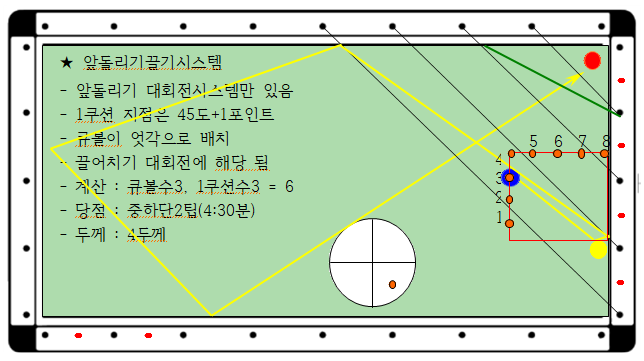 제일 먼저 프로당구협회(PBA)에서 정의한 당구용어부터 한번 읽어보신 후 아래 시스템을 보시면 이해가 빨리 될 것입니다. 그리고 일본인들인 한 짖(귀무덤, 코무덤 등)을 생각하면서 ""일본말""은 당구장에서 사용 안 했으면 합니다.