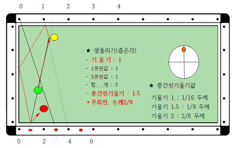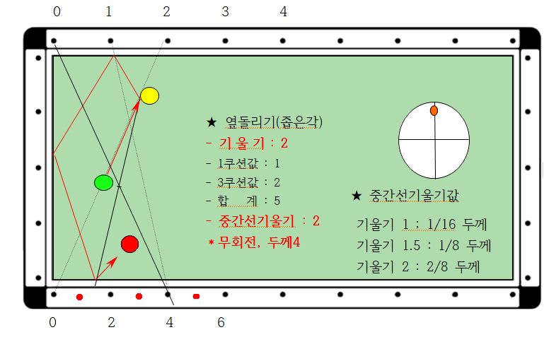 4) 큐볼의 기울기2와 중간선기울기 2.0을 합하면 큐볼의 두께를 4/8두께입니다