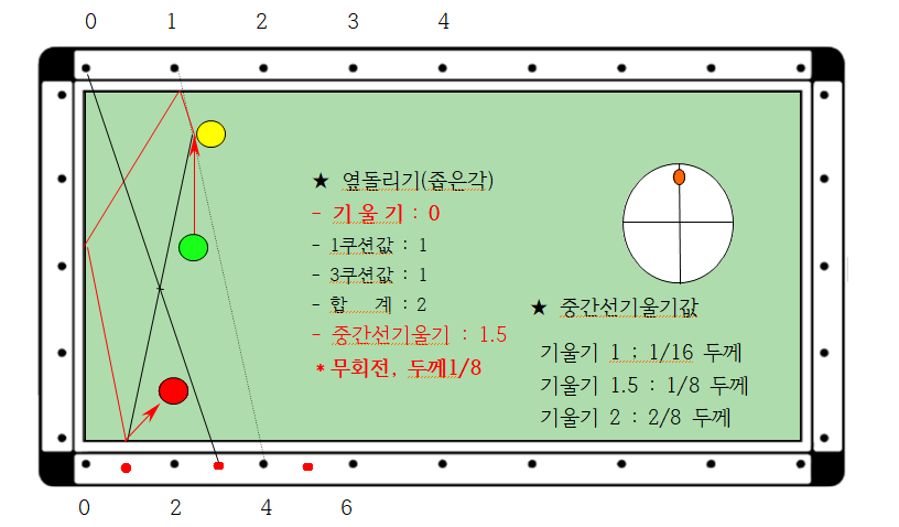 1. 기울기가 0(제로)으로 보고 무회전으로 큐볼을 보냈을 경우 3쿠션 위치를 정합니다.