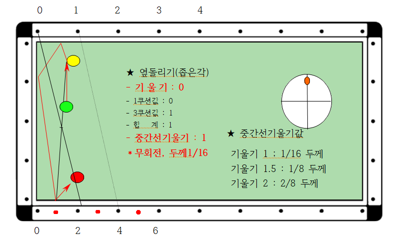 4) 이 선분대로 큐볼을 보내려면 즉 기울기가 1.1정도 이므로 두께는 1/16입니다