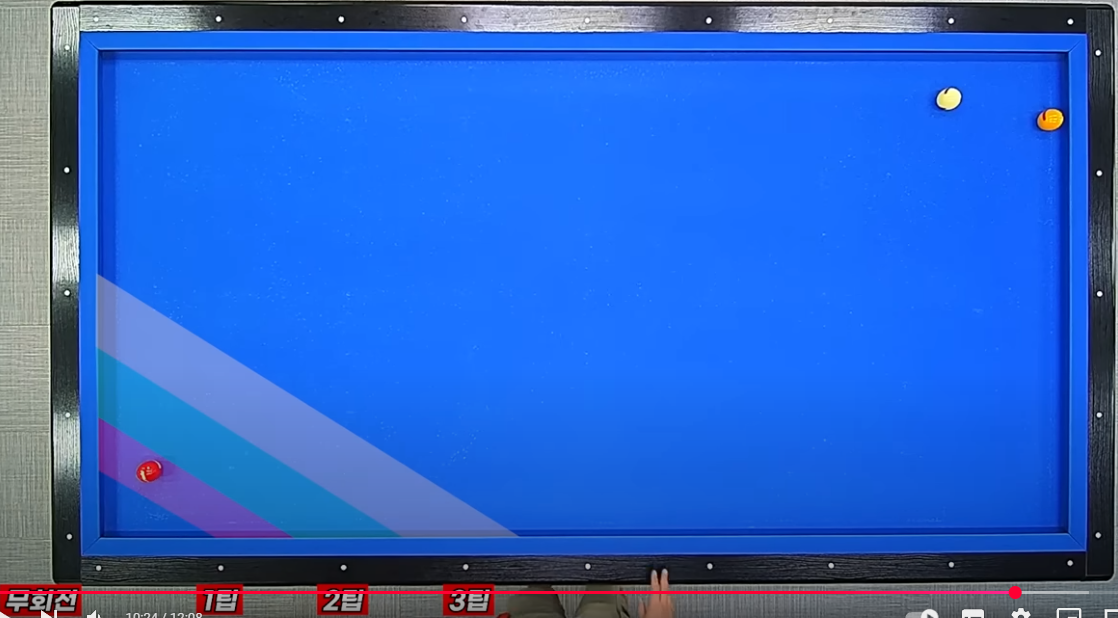 4. 1목적구가 코너 근방에 있으므로 무회전(하단3팁)으로 큐볼을 보냄