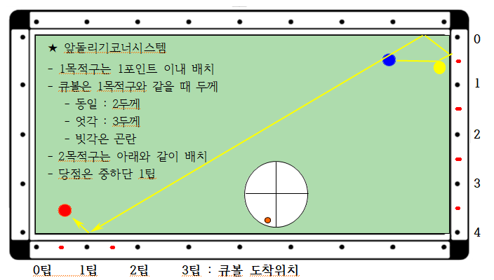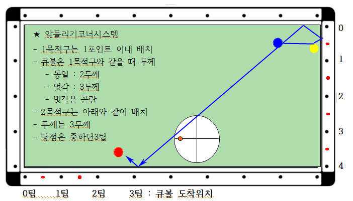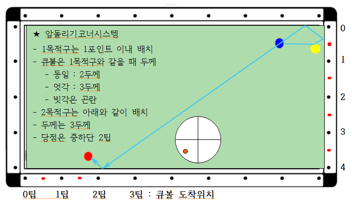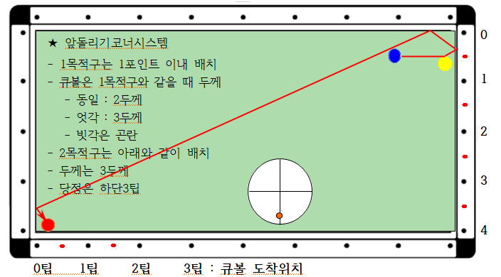 - 아래 도면과 같이 큐볼과 1목적구는 코너 근방에 배치, 2목적구는 대각선 반대 코너 근방에 배치