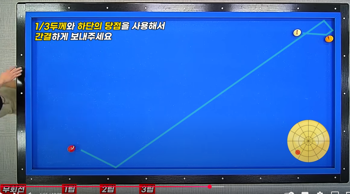 3. 큐볼은 기울기 1 정도(공1개 정도 기울기)로 배치된 경우 3두께3 두께로 보냄