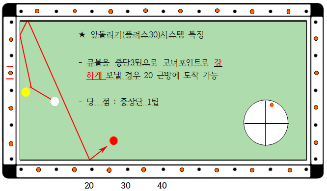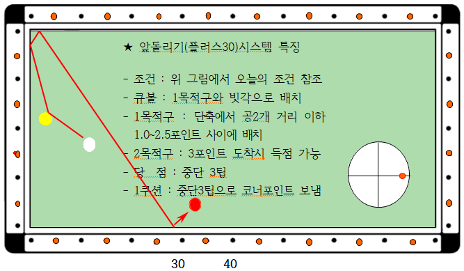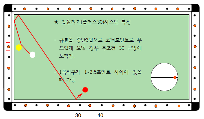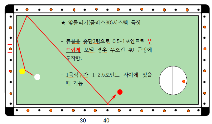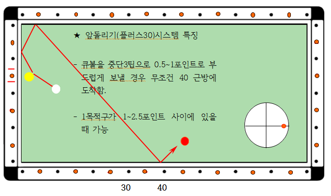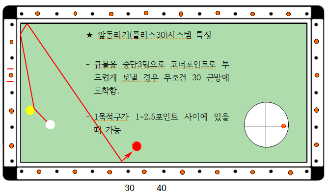 앞돌리기(플러스30)시스템이란 도면1과 같이 1목적구가 단축 공2개 이하 거리에 배치되고 큐볼이 1목적구와 빗각으로 배치되고 2목적구 플러스시스템의 30 포인트 근방에 있을때 이 시스템을 외우기(기억) 쉽게 하기 위하여 제가 지은 이름임을 참고하시기 바랍니다.