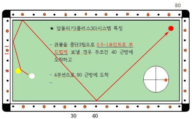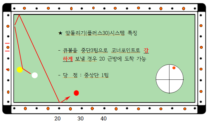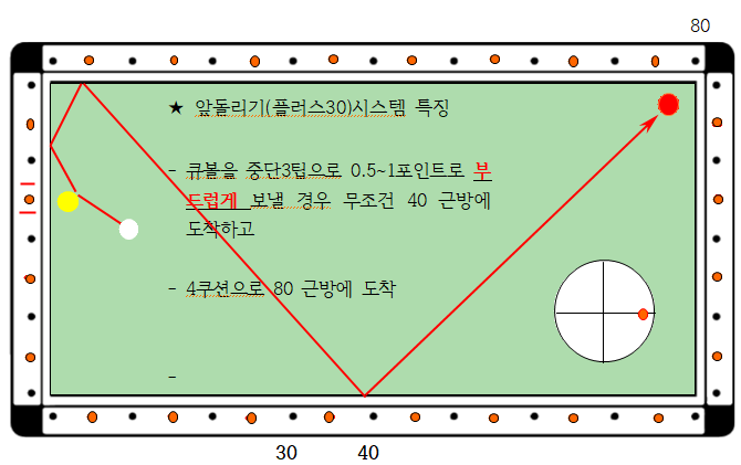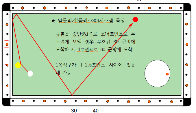 - 큐볼을 중단3팁으로 코너포인트로 부드럽게 보낼 경우 무조건 30 근방에 도착하여야 함.