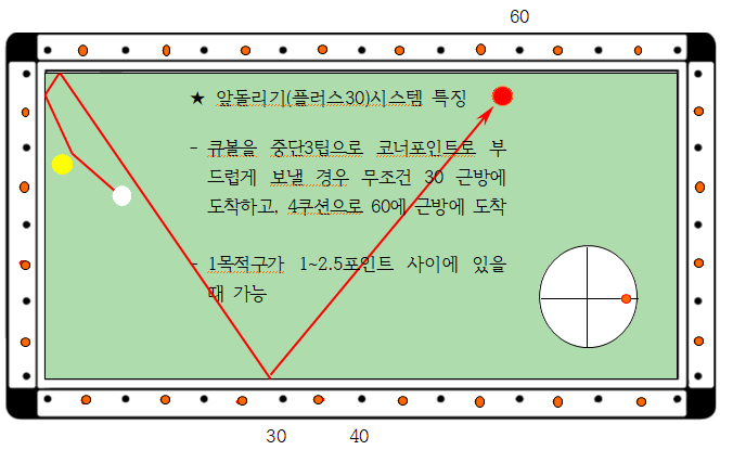- 큐볼을 중단3팁으로 코너포인트로 부드럽게 보낼 경우 무조건 30 근방에 도착하고, 4쿠션으로 60에 근방에 도착