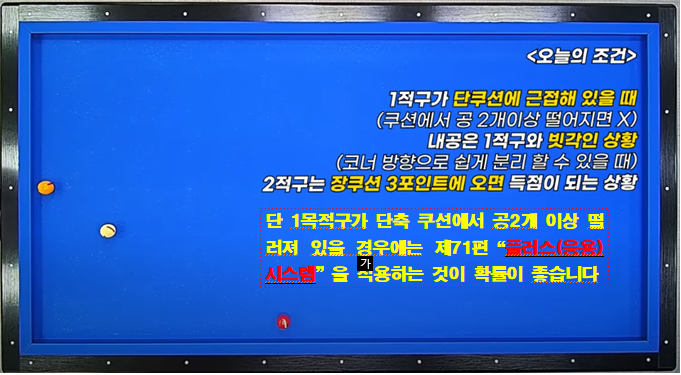 참고로 1목적구가 단축에서 공3개 이상 떨어져 있을 경우에는 플러스시스템을 적용합니다. 다만 이 시스템은 1목적구가 단축에서 ""공2개 이하 떨어져 있을 경우""는 플러스시스템의 특수사항이라 할 수 있습니다.