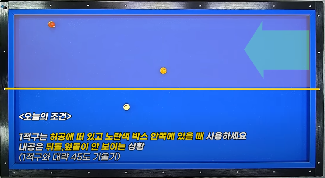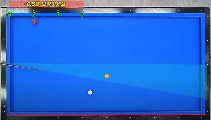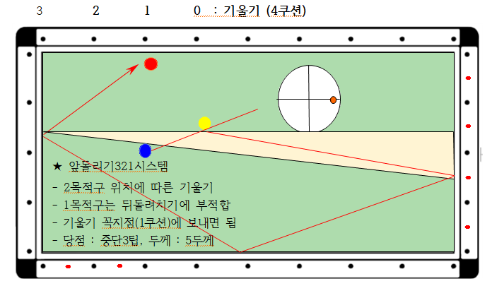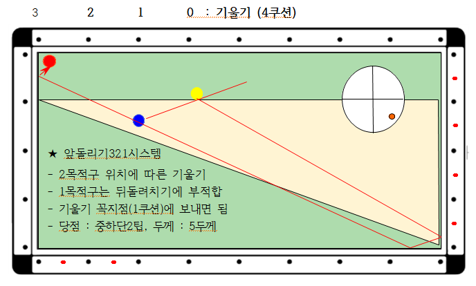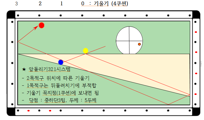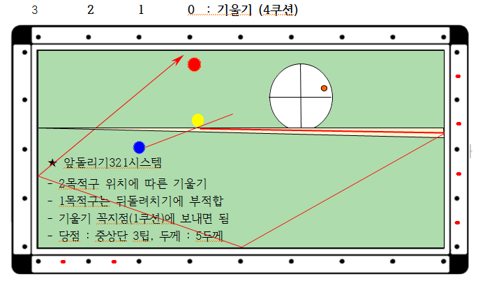 - 1목적구가 청색선 범위에 배치된 경우에는 4쿠션위칙를 -0.5 포인트(기울기) 를 빼면 됩니다
