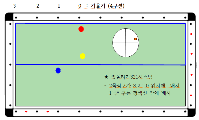 - 2목적구가 아래 도면과 같이 3,2,1,0 위치(4쿠션)에 배치된 경우