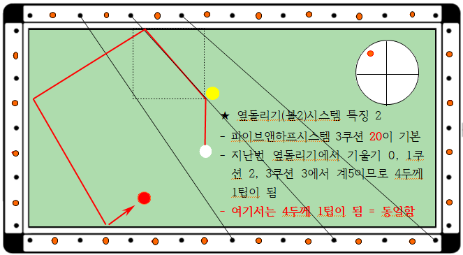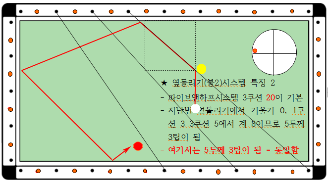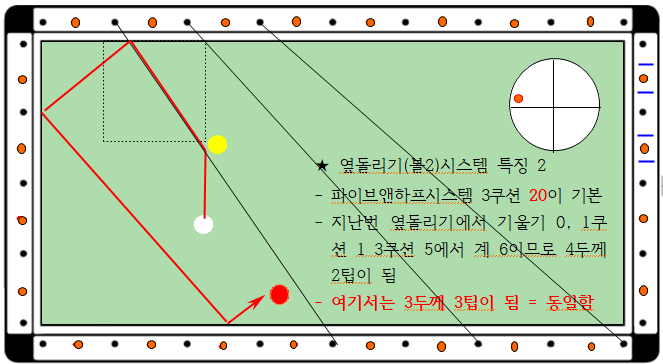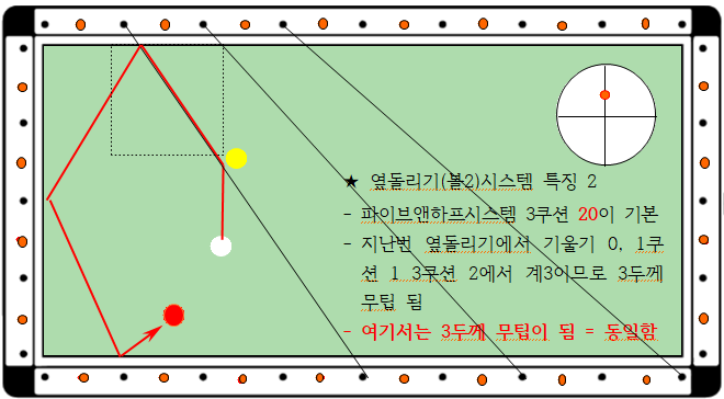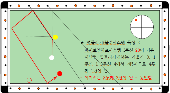 옆돌리기(볼2)시스템이란 큐볼과 목적구 2개가 4포인트 이내에 있고 옆돌리기가 기능한 배치가 되어 있는 경우에 해당합니다.