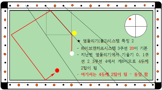 파이브앤하프시스템에서 중상단2팁으로 출발(30) 1쿠션(10) 하면 3쿠션(20)에 도착하고, 출발(40) 1쿠션(20) 하면 3쿠션(20)에 도착하고, 출발(50) 1쿠션(30) 하면 3쿠션(20)에 도착하는 경우로서 2목적구 위치에 따라 당점을 조정하면 득점할 수 있습니다.