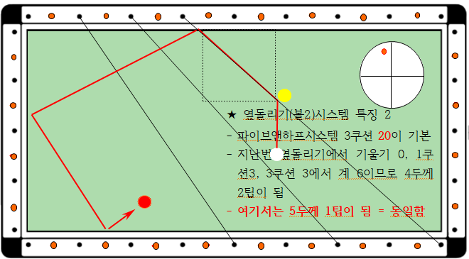 - 지난번 옆돌리기에서 기울기 0, 1쿠션 2, 3쿠션 3에서 계5이므로 4두께 1팁이 됨