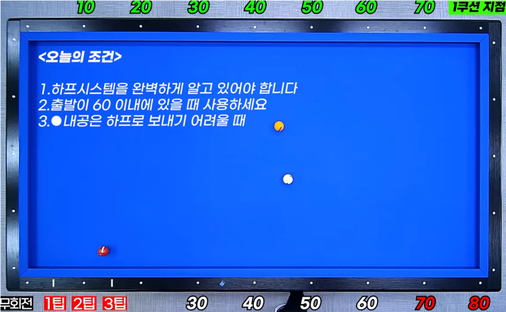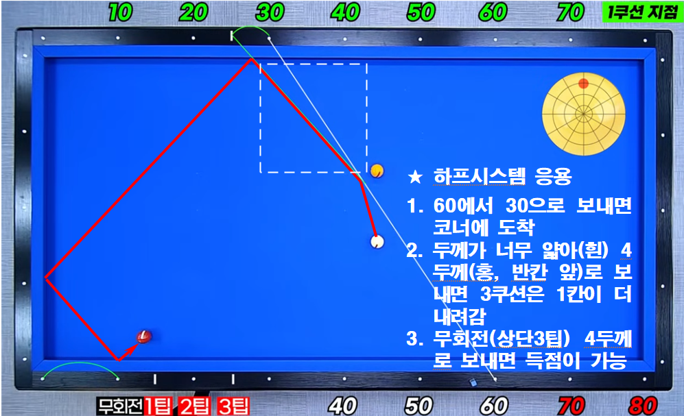 이 옆돌리기(하프)시스템은 하프시스템을 완전히 알고 있어야 하는데 파이브앤하프시스템 수구수 60 이내에 있을때 사용하는 것이 3쿠션에 득점 확률이 높아집니다