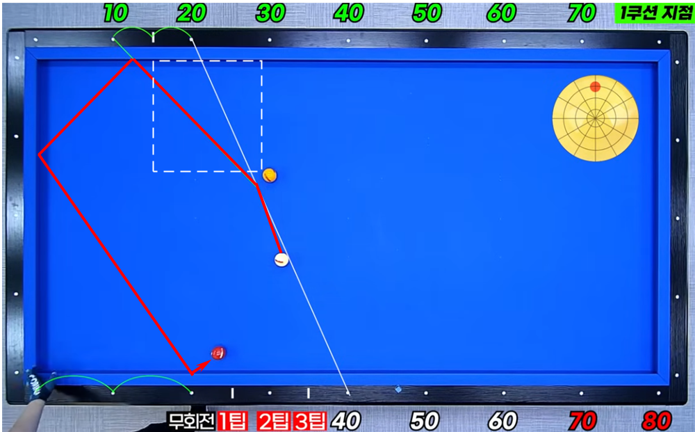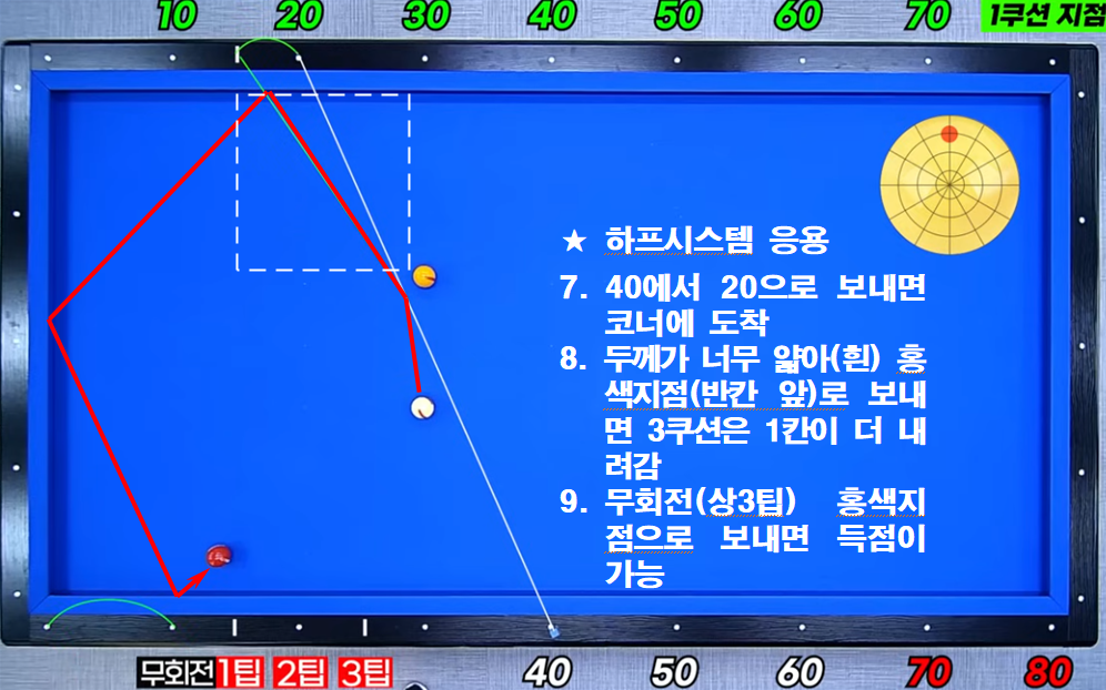 이 옆돌리기(볼3)시스템의 원리는 하프시스템으로 20에서 10, 40애서 20, 60에서 30으로 보내면 코너에가는 것을 기본으로 1팁으로 장축 0.5포인트, 2팁은 1포인트 3팁은 1.5포인트에 도착하는 원리 입니다