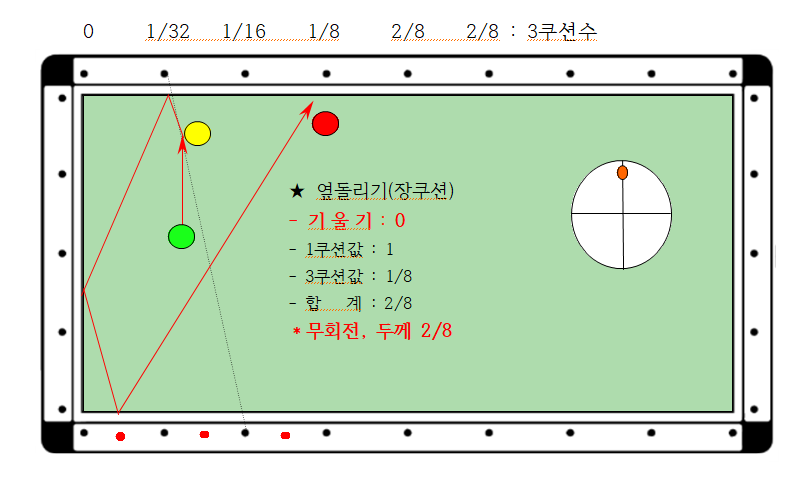 - 장쿠션 1포인트 근방에 있을때 3쿠션수는 1/32 두께
