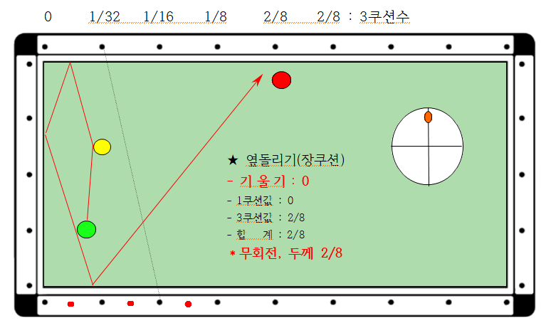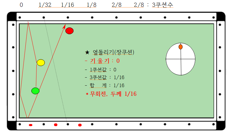 5. 따라서 당점 상단2팁, 두께 1/16 큐대를 1레일 속도로 부드럽게 보낸다면 득정이 가능합니다. 다만 1/16두께는 아주 얋게치면 가능하나, 사실상 1/32는 정말로 어렵기 때문에 도면을 생략합니다.
