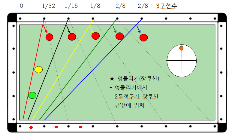 1. 옆돌리기(좁은각장쿠션)시스템으로 2목적구가 장쿠션 5포인트 이내에 배치되어 있어 무회전으로 득점하는 경우에 해당합니다. 즉 회전이 들어가면 큐볼이 늘어져 득점확률이 낮아집니다.