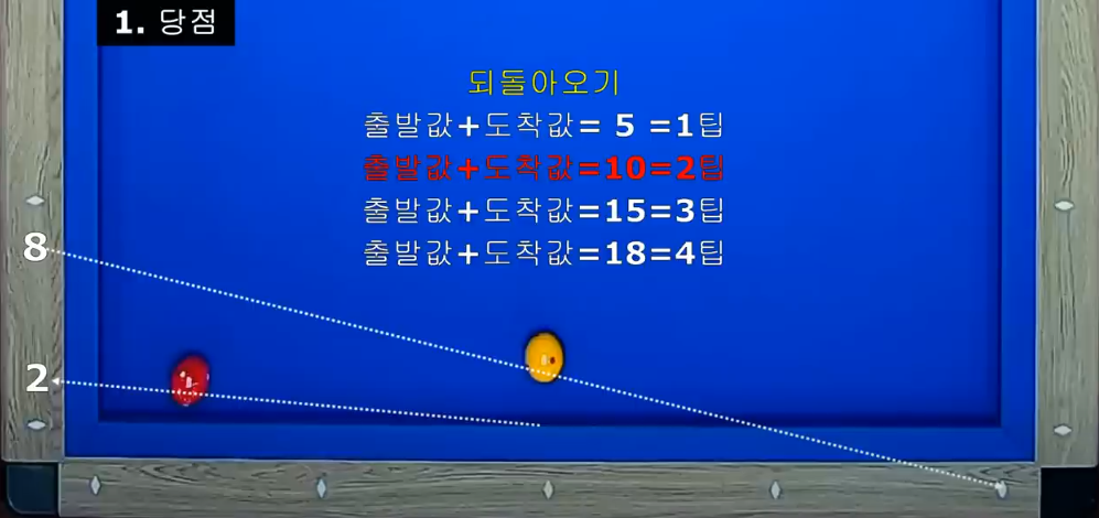 - 도착값 계산방식 : 1목적구 측면 쿠션포인트 기준으로 2목적구를 1두께로 맞는 조건으로 도착한 값