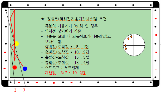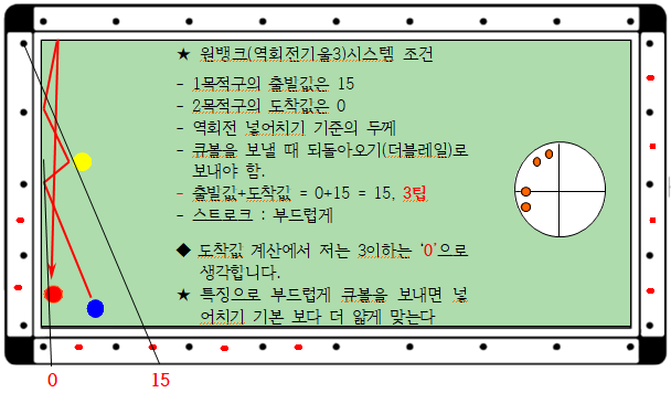 원뱅크시스템 중에서 2목적구 때문에 반드시 역회전으로 큐볼을 보내야 하는 경우에 해당하는데 여기서는 장축에 위치하거나 단축에 위치하거나 """큐볼의 기울기가 3 이하""""로 배치된 경우에 해당합니다