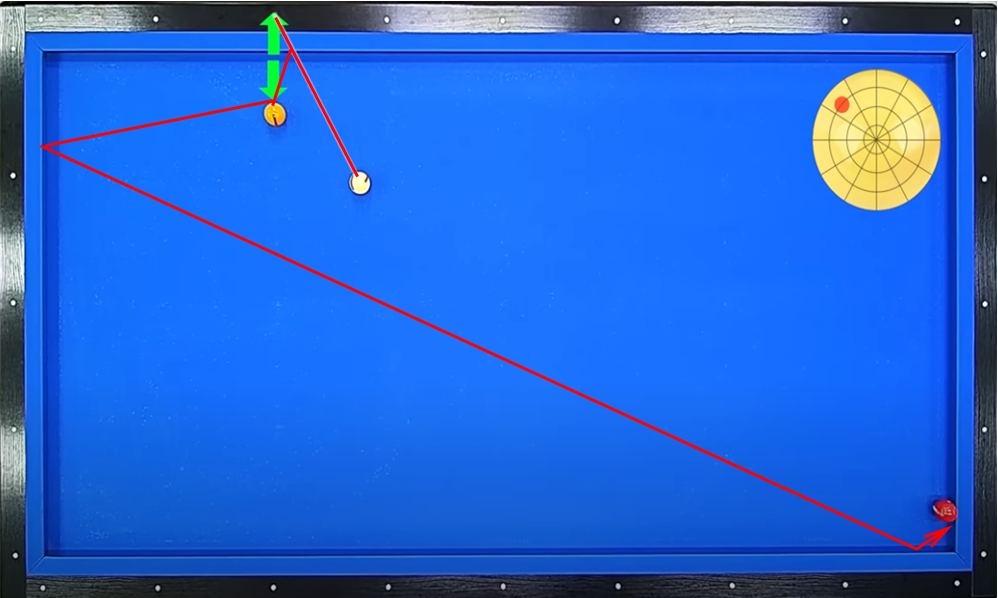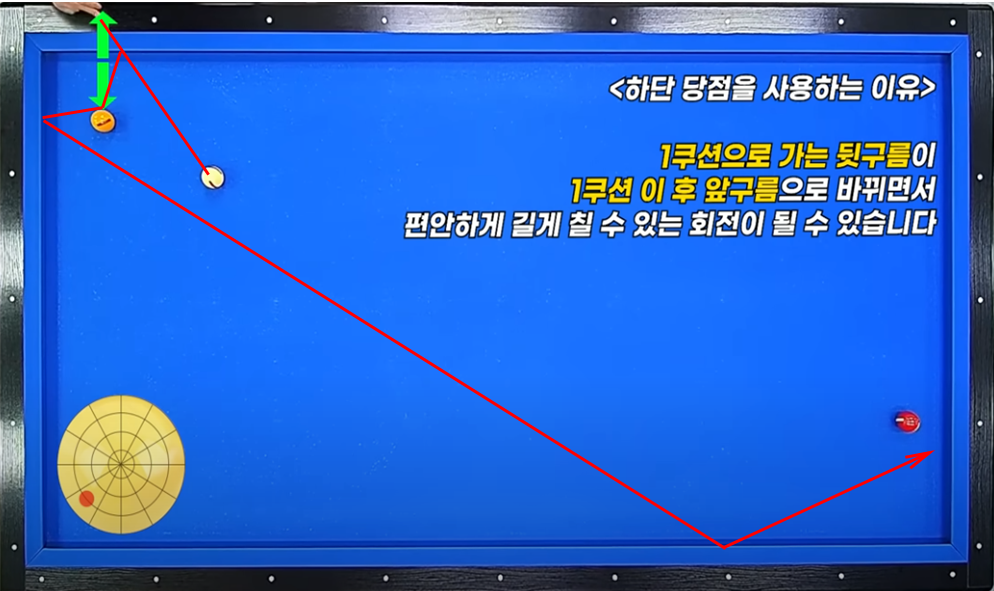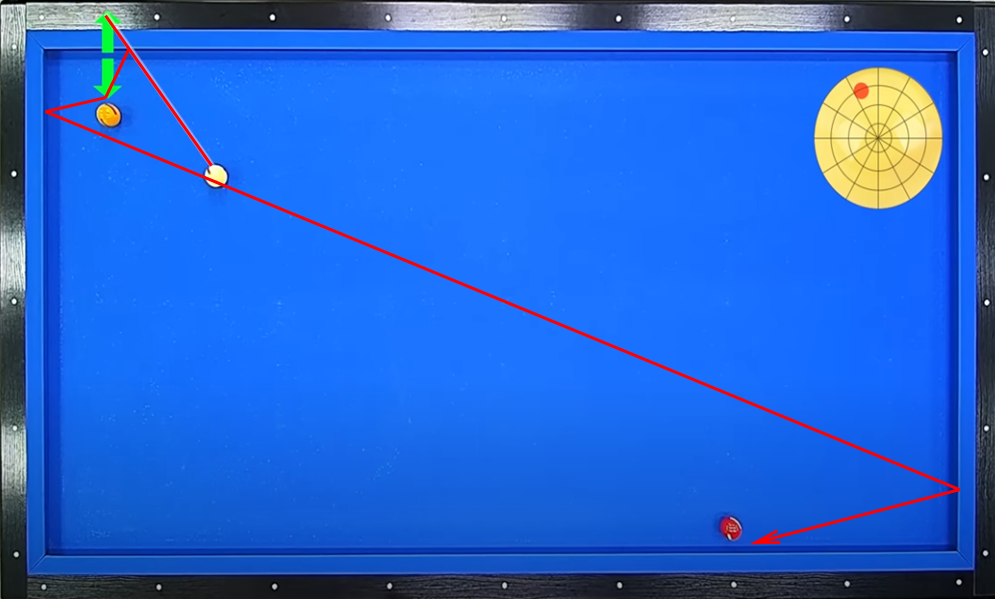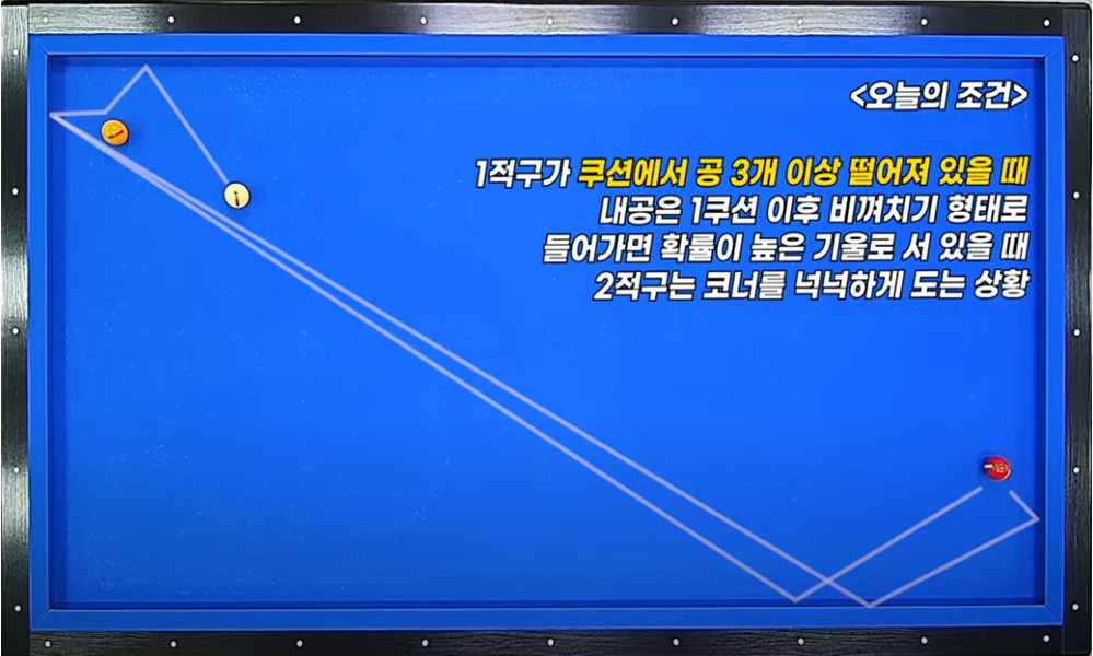 목적구 2개가 대각선으로 배치되어 있고 원뱅크로 넣어치기가 가능할 때 큐볼을 보내는 3쿠션 시스템 중 하나입니다입니다.