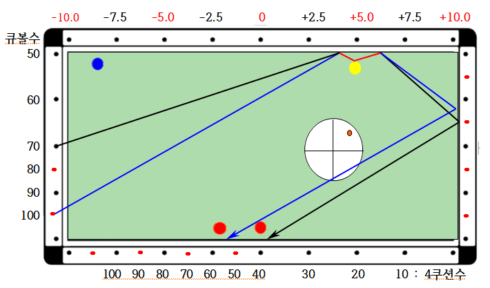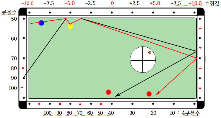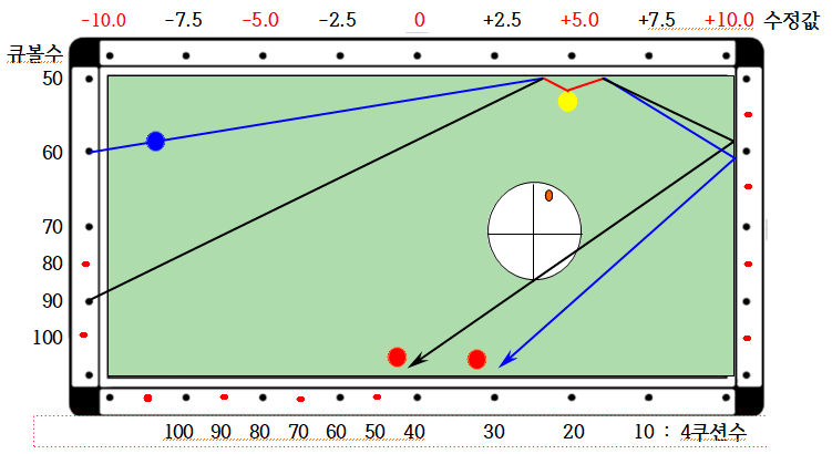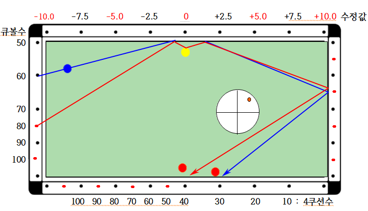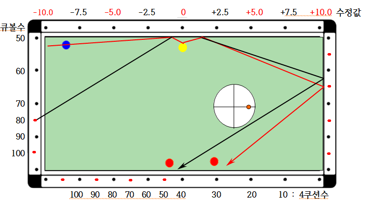 4. 공식 : 4쿠션 지점 = 큐볼수/2 + 수정치 인데 4쿠션값과 2목적구값이 상이할 경우