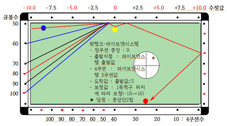 ★ 원뱅크시스템 중 넣어치기에 해당하는데 이 시스템의 첫번째 특성은 파이브앤하프시스템을 응용하는 것으로 큐볼의 출발점(50)이 반대로 부여되는 점이 다릅니다.