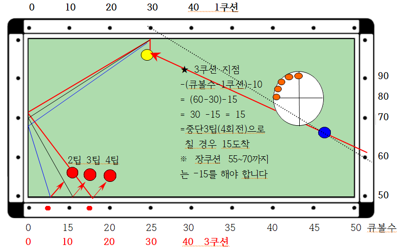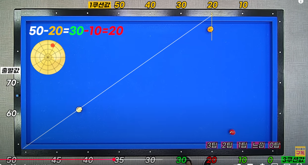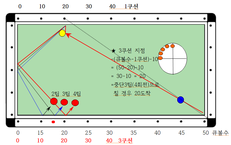 공식대로 표기하면 (50-20)-10 = 20, 즉 20이 3쿠션지점입니다