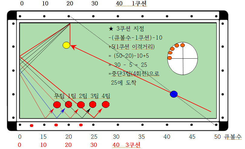 3. 즉 당점은 4팁으로 (큐볼수-1쿠션수)-10+5(보정값) 하면 됩니다. (50-20)-10+5 = 25가 됩니다