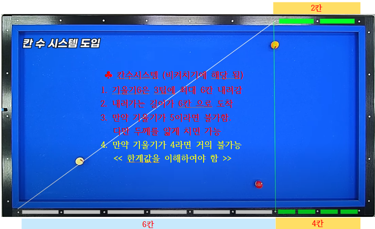 4. 아이쿠 두께를 설명안 했군요 두께는 기울기가 7이므로 4.5두께 인데 4두께 이상으로 1목적구를 치게 되면 큐볼이 밀리는 현상이 발생하므로 4두께로 치고 스트로크로 조절하는 것이 좀 더 났지 않을까 합니다