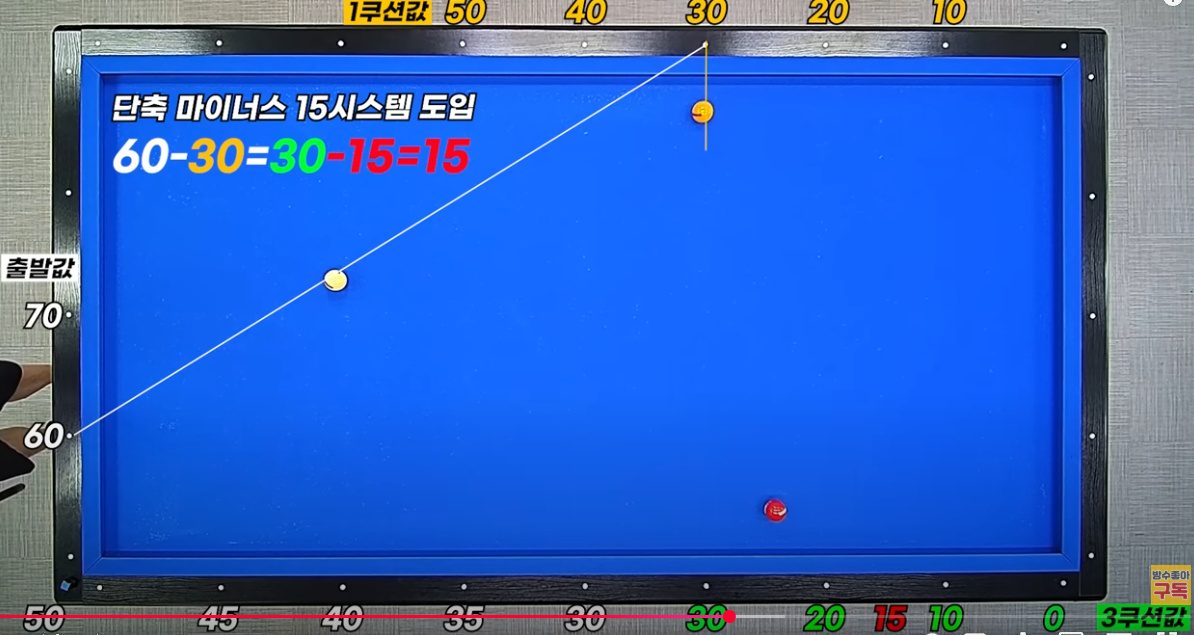2. 큐볼수 60, 1 쿠션수 30이므로 (60-30)-15 = 15가 되지요 여기서 단축 출발일 경우 마이너스 15를 합니다