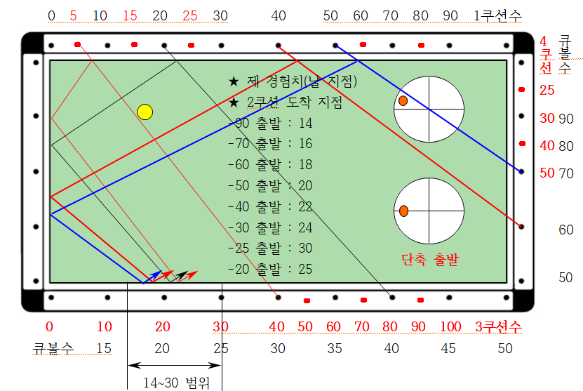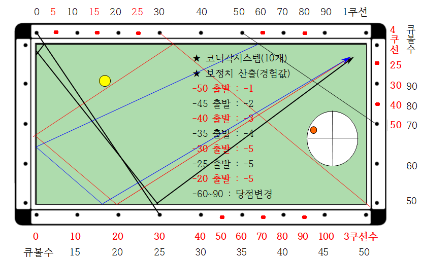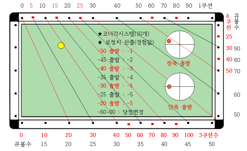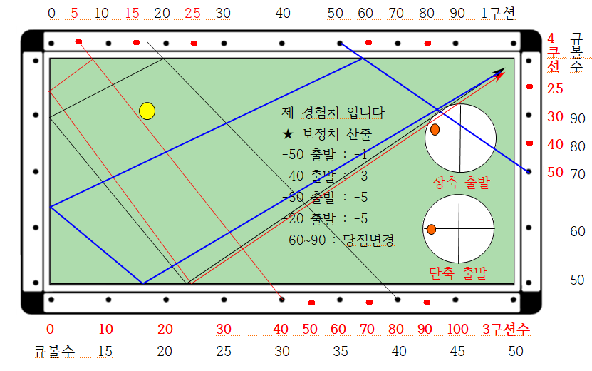 나. 실제 게임에서는 파이브앤하프시스템에서 보정치를 고려하여 1쿠션에 보내야 하는데 제가 경험한 경험값은 다음과 같습니다. 결론적으로 단축 출발은 당점(중단3팁)만 조정하고, 장축 출발은 40(-3), 30(-5) 두가지만 외우고 나머지는 이 2개를 기준으로 생각을 정리하면 됩니다.