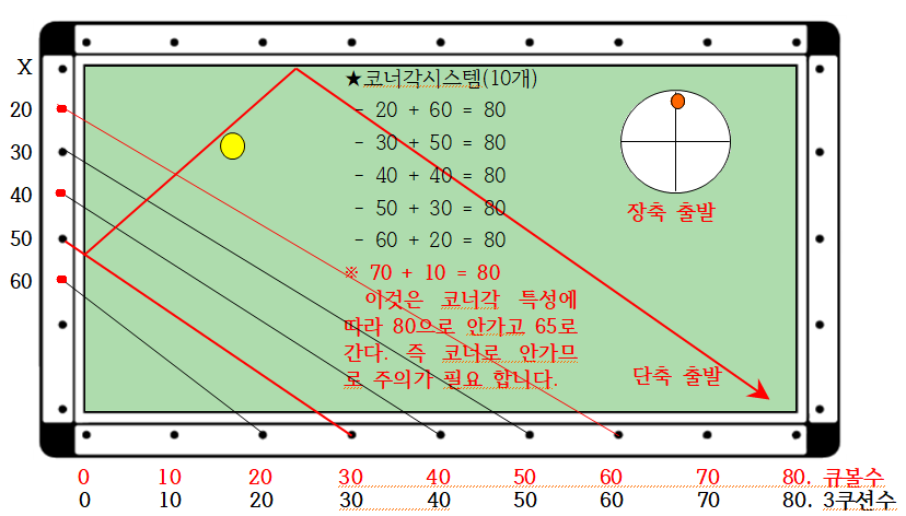 나. 단 큐볼수 10에서 70으로 가는 길은 80으로 가는 확률이 많이 낮고, 70에서 코너(X)로 가는 길은 코너의 특성 때문에 80으로 가지 않고 65로 가기 때문에 코너각 라인이 아닙니다(코너포인트시스템 참조).