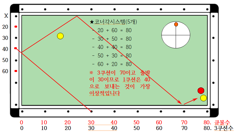 다. 즉 큐볼수 40에서 1쿠션 40으로 보내면 코너로 간다. 2목적구를 바로 맞히면 2쿠션이 되므로 2목적구 위치에 따라 3쿠션이 되기 위해서는 플러스시스템을 참조하여 1쿠션 지점을 조금 가감하여 보내야 합니다.