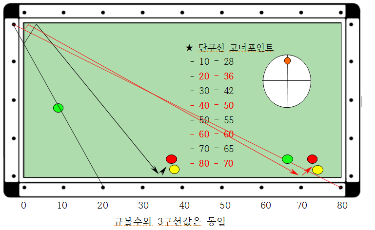 2. 상단3팁 느낌팁으로 큐볼수 60에서 단축 코너로 보내면 60으로 되돌아와서 3쿠션으로 득점이 되어야 하는데 2목적구가 2포인트 내려가 있으므로 반대로 1쿠션은 올려야 합니다. 이 경우에는 플러스시스템을 적용하면 됩니다 (80-60 = 20) 즉 1쿠션은 20으로 보내면 득점이 된다는 이야기입니다.