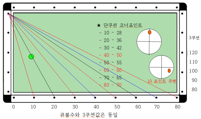 제일 중요한 것은 코너를 단장(단쿠션 먼저)으로 맞히고자 할 경우 큐볼수 60에서 코너로 치면 3쿠션 값이 60으로 되돌아옴을 기억하여 앞뒤로 외우면 좋고, 단 X의 값은 참고용이므로 외울 필요는 없습니다