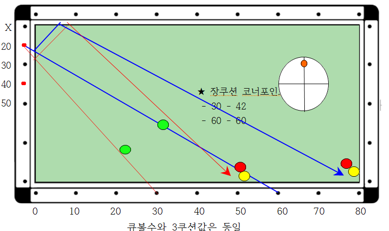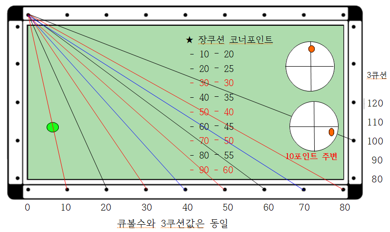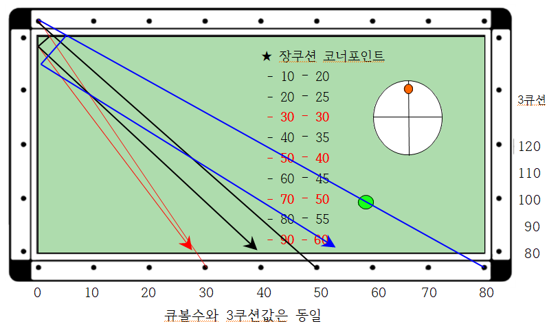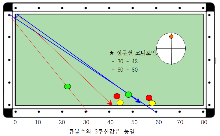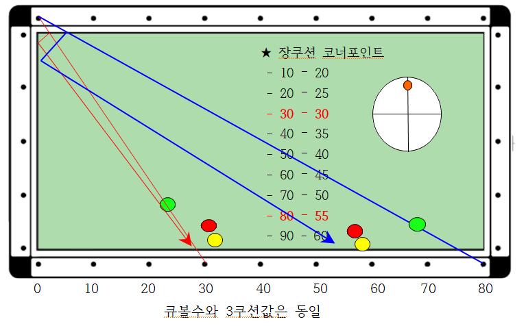제일 중요한 것은 코너를 장단으로 맞히고자 할 경우 큐볼수 30에서 코너를 장단으로 치면 3쿠션 값이 30으로 되돌아옴을 기억(3쿠션값)하여 앞뒤로 외우면 좋습니다.