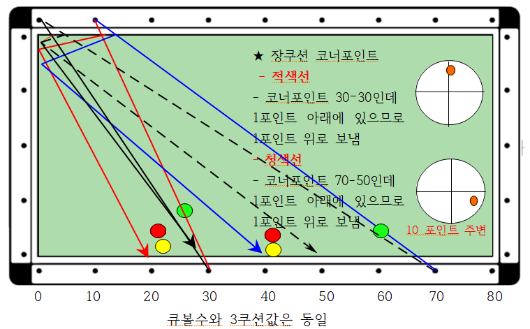 2. 상단3팁 느낌팁으로 큐볼수 70에서 장축 코너로 보내면 50으로 되돌아와서 3쿠션으로 득점이 되어야 하는데(흑색점선) 2목적구가 1포인트 앞쪽에 있으므로 1쿠션은 반대로 1포인트 뒤쪽으로 보내면 3쿠션으로 득점이 가능하다는 설명입니다(청색선)