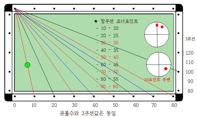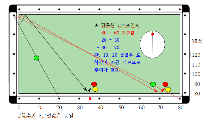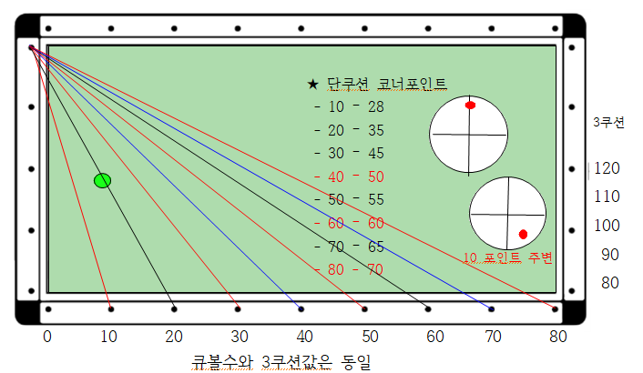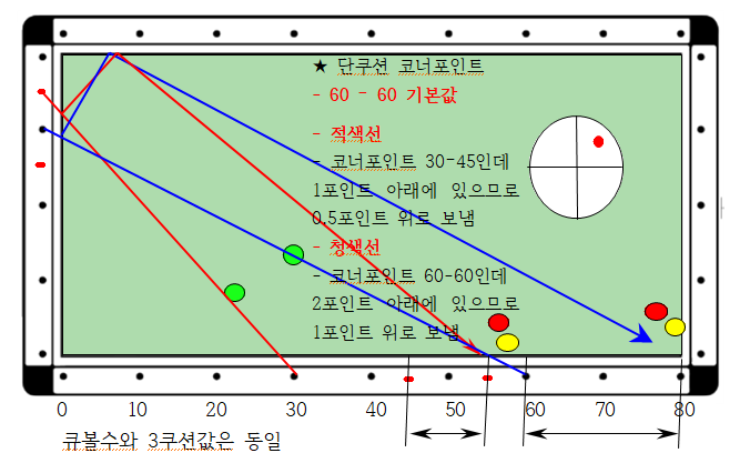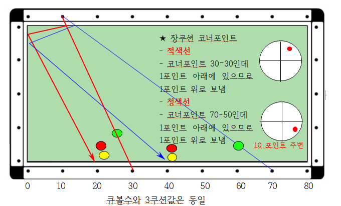- 코너포인트는 장축코너와 단축코너 2개가 있는데 큐볼을 어느곳으로 보내야 하는지를 결정한다