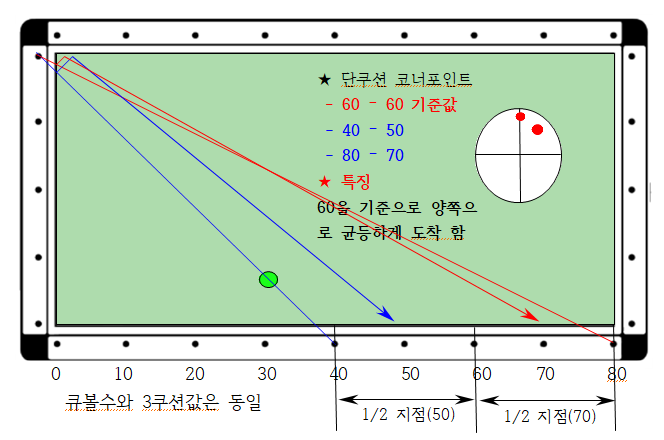 2) 30에서 출발하면 45로 간다 즉 30과 60 사이 중간 지점(45)으로 가는데 목적구가 1포인트 아래에 있으므로 큐볼을 0.5포인트 앞쪽으로 보내면 득점이 유리합니다.